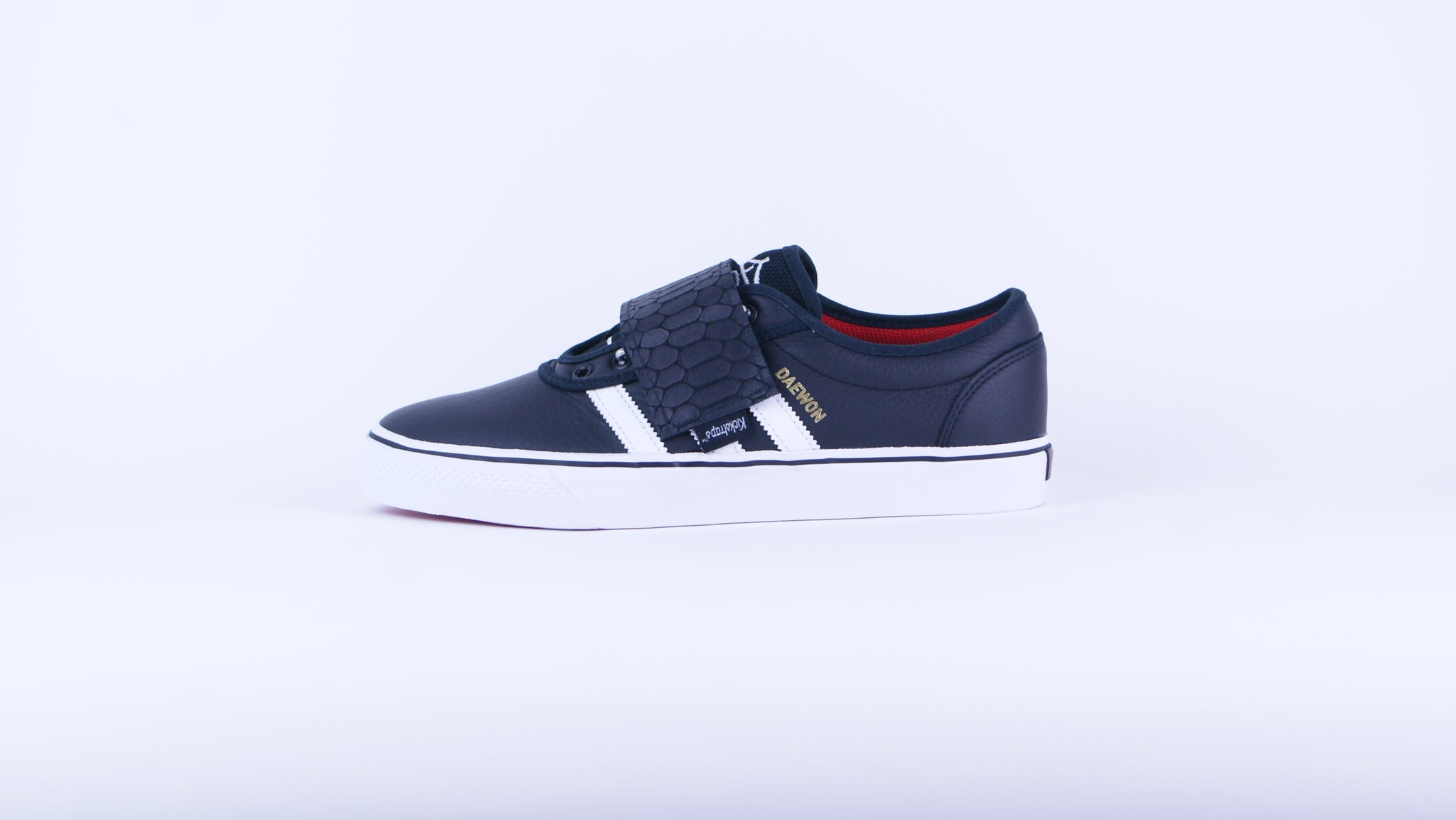 During the world premiere of adidas' first full length video Away Days it was revealed that the legendary Daewon Song had joined the prestige adidas skate team. Accompanying the exciting news, Daewon receives his first signature pro model colorway upon the classic AdiEase. Made with a durable black leather upper, molded PU insole, and a vulcanized construction, these shoes have a simple yet stylish low-profile silhouette. The footwear had purposely been designed with asymmetrical outsoles and interiors in the colors of red and blue paying homage to Daewon's heritage, the colors of the Korean flag.